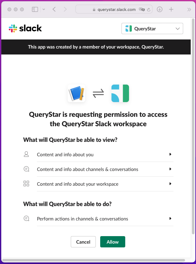After this section, you will be able to install QueryStar app to your Slack Workplace, and obtain a QueryStar token to develope your own bots.