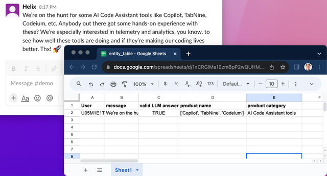 Once a trigger event happens, the bot calls the LLM function and get extracted product entities and category. Then the bot adds the extracted data to a Google Sheet. The code: