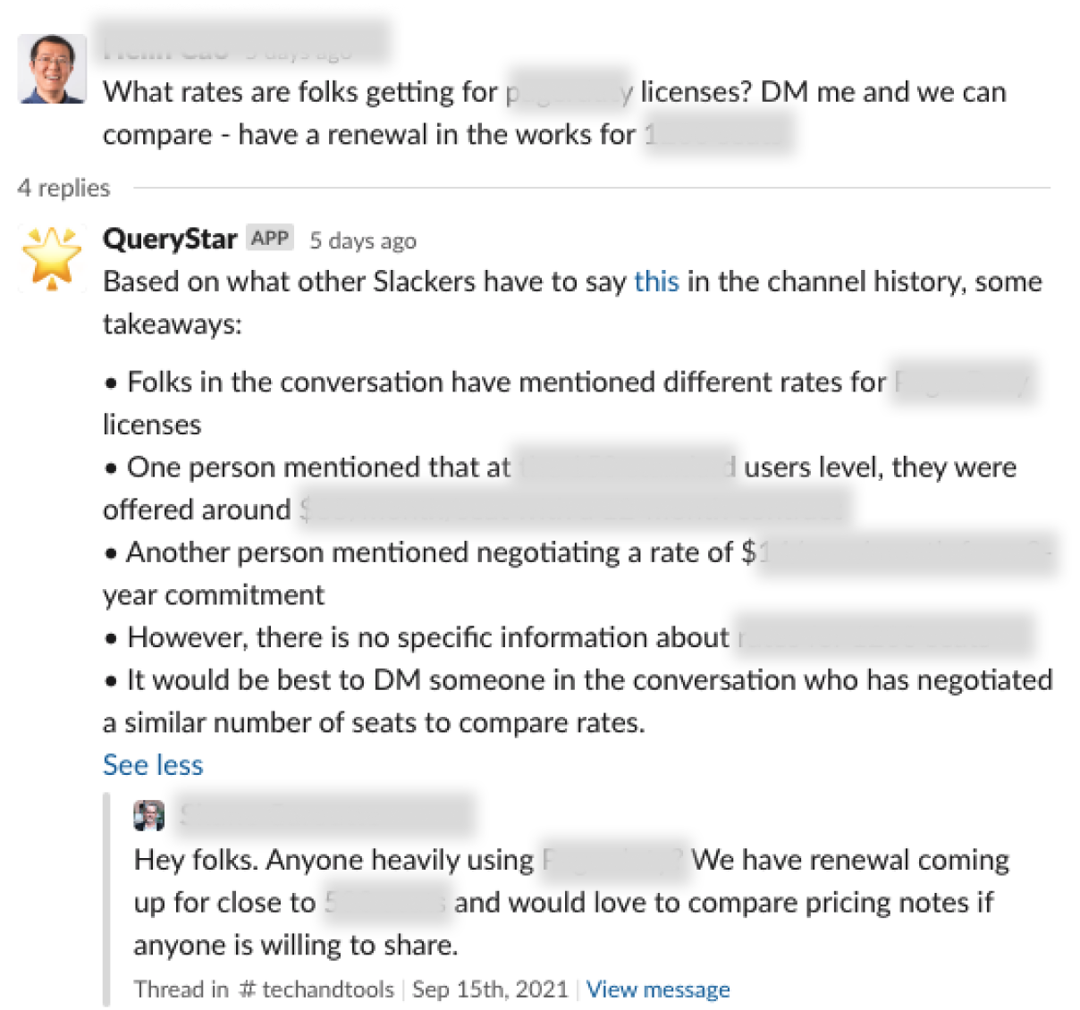 A Slack community of 1,000 CTOs and VPs has 6 years of chat history, which is full of best practices and industry insights. However, Slack search can no longer serve them well. QueryStar built a knowledge base on top of the chat data, and automatically respond to questions.
