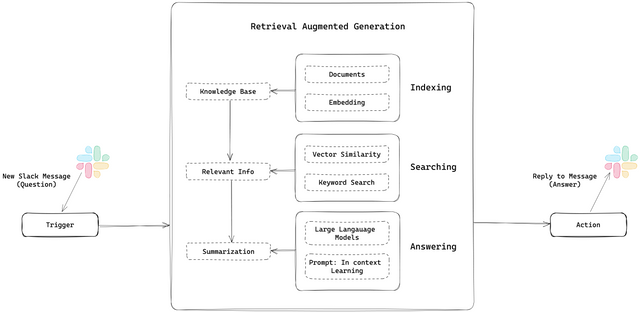 To understand better the new evolution of workflow automations, lets dive deep into an example of document based question-answering, by designing the triggers-actions, and implementing RAG. The use case would be to implement a Slack bot to answer a question posted to a channel. The question will be based on a few documents.